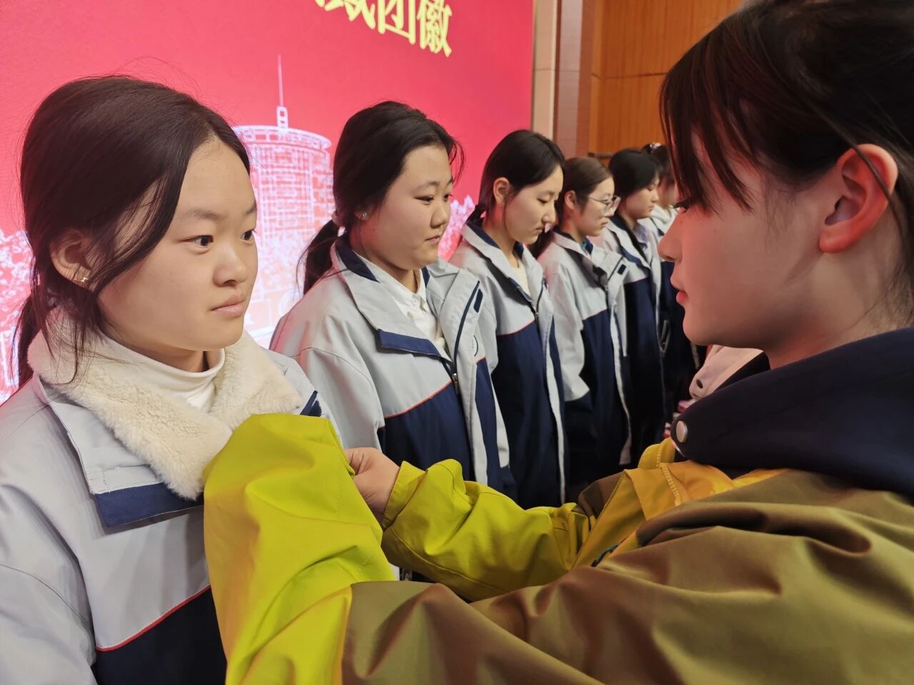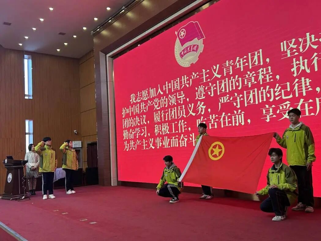 在全场的注目下,老团员代表上台为新团员代表佩戴团徽。当熠熠生辉的团徽闪耀在胸前,新团员们的脸上洋溢着自豪与坚定,这枚团徽不仅是身份的象征,更是责任与使命的传承,从此刻起,他们将以团员的标准严格要求自己,在青春的赛道上奋力奔跑。